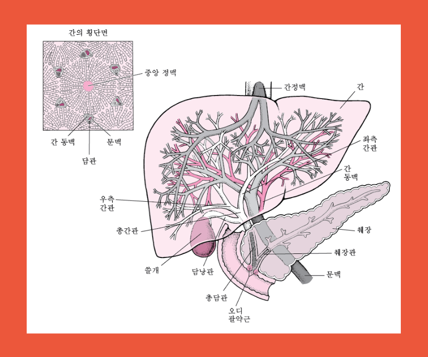 간과 담낭의 구조를 보여주는 해부학적 도해입니다. 그림에는 간의 내부 구조와 혈관, 담관, 쓸개(담낭), 그리고 주변 장기들이 표시되어 있습니다. 간의 단면과 세포 구조도 포함되어 있습니다.